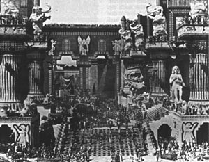 IntoleranceDie Intoleranz Die Tragödie der Menschheit Regie: David Wark Griffith USA Darsteller: Lillian Gish, Mae Marsh, Robert Harron, Howard Gaye Anhand von vier parallel erzählten historischen Ereignissen illustriert Griffith, daß Intoleranz seit alters her das menschliche Handeln bestimmt. Intolerance wurde in jeder Hinsicht ein Mammut-Unternehmen: Griffith ließ am Rand des damaligen Hollywood die größten Dekorationen aufbauen, die bis heute für einen Film errichtet wurden. Rund 70 Meter hoch waren die massiven Türme Babylons; Belsazars Festhalle faßte mehr als 5000 Menschen. In einer Kampfszene befehligte Griffith von einem Ballon aus 16 000 Komparsen.(!) Der Film wurde ein finanzieller Mißerfolg, da er wegen der pazifistischen Aussage nicht in eine Zeit paßte, in der die USA zum Eingreifen in den Ersten Weltkrieg rüsteten. |