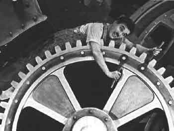 | Moderne Zeiten Regie: Charles Chaplin USA Darsteller: Charles Chaplin, Paulette Goddard, Chester Conklin Zum letzten Mal trotzt Chaplin hier dem Tonfilm - er gibt allenfalls Nonsensworte von sich. Der Film ist Chaplins Antwort auf die modere Massenproduktion und die Abstumpfung der Menschen. Die berühmte Szene in der