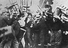 ![]() Die Affäre Dreyfuss Frankreich Georges Méliès schildert in elf im Studio nachgestellten Szenen einen französischen Justizskandal, der damals im Lande zu schwersten innenpolitischen Krisen führte und die ganze europäsche Presse in Atem hielt. Er stützte sich dabei auf Dokumentarfotos und -zeichnungen, die er teilweise minutiös in bewegte Bilder umsetzte. Der Film entwickelte sich damals auf den Jahrmärkten und in den festen Kinos zum Kassenschlager und wurde auch im Ausland vertrieben. |