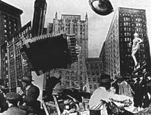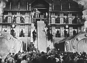 Metropolis Regie: Fritz Lang Deutschland Darsteller: Brigitte Helm, Alfred Abel, Heinrich George Eine Zukunftsstadt ist in zwei Bezirke eingeteilt: Herrenmenschen wohnen in Hochhäusern während die Arbeitermassen unter der Erde hausen. Der Sohn des Herrschers verliebt sich in eine Arbeiterführerin und es kommt zu einer Rebellion und einem schnulzigen Happy-End. Metropolis gilt als der erste deutsche Science-Fiction-Film und übte doch eindeutige Sozialkritik. Die Menschenmassen und vor allem die riesigen Maschinen sind eindrucksvoll und viele tricktechnischen Aufnahmen stellten alles bisher dagewesene in den Schatten. Dem aufwendigen und horrend teuren Film blieb aber der Erfolg beim Publikum versagt und stürzte die Ufa in eine ernste Finanzkrise. |