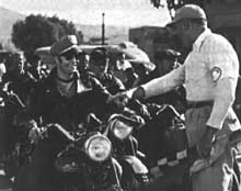 Wilde Regie: Laszlo Benedek USA Darsteller: Marlon Brando, Lee Marvin, Mary Murphy Marlon Brando in einer Paraderolle als halbstarker Anführer einer Motorrad-Rocker-Bande, die die Bewohner einer Kleinstadt provoziert. Regisseur Laszlo Benedek drehte wohl den ersten 'Road-Movie'. In Großbritannien ist das aufrührerische Werk bis 1968 verboten. Die jugendlichen Fans des Films imitierten die Aufmachung Brandos, um ihre Rebellion gegen die Dogmen der Erwachsenen auszudrücken. |